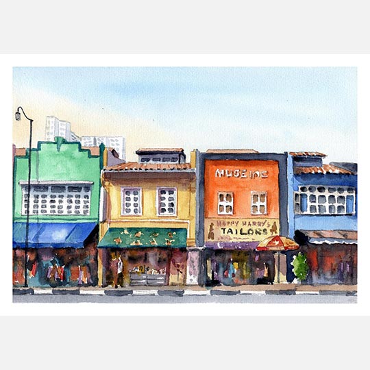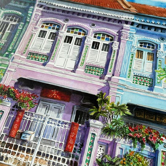 Step into Singapore’s historic streets through watercolour. This workshop draws inspiration from Chinatown’s shophouses, where rows of colourful facades, intricate architectural details, and narrow streets create a vibrant dialogue between heritage and everyday life. Subtle elements of modern Singapore may appear in the background, grounding the scene within the city’s evolving landscape without overpowering the traditional character.