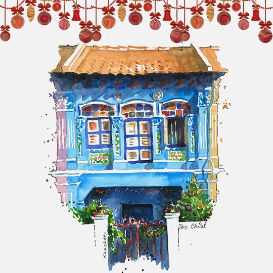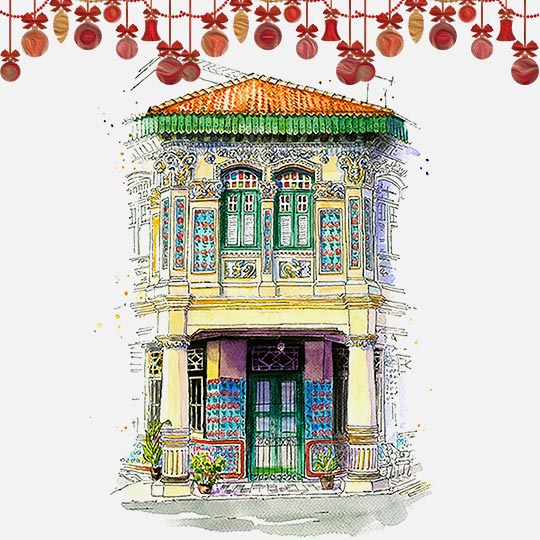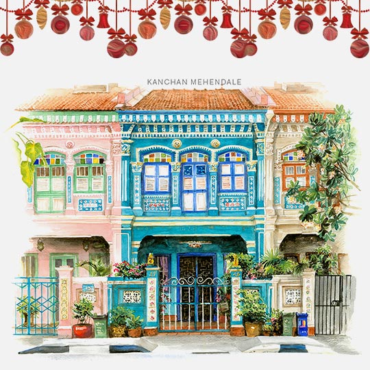 Join Kanchan Mehendale for a fun and festive watercolour workshop, where you'll paint a vibrant Joo Chiat shophouse, infused with Christmas cheer!