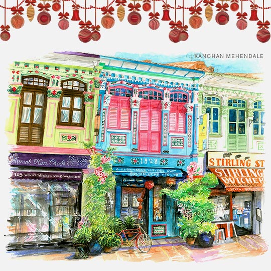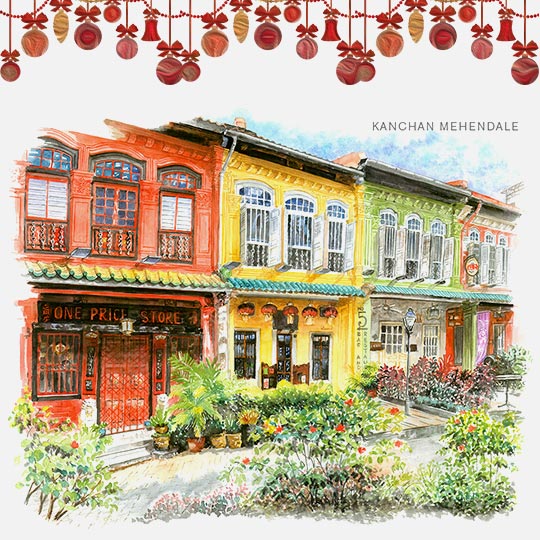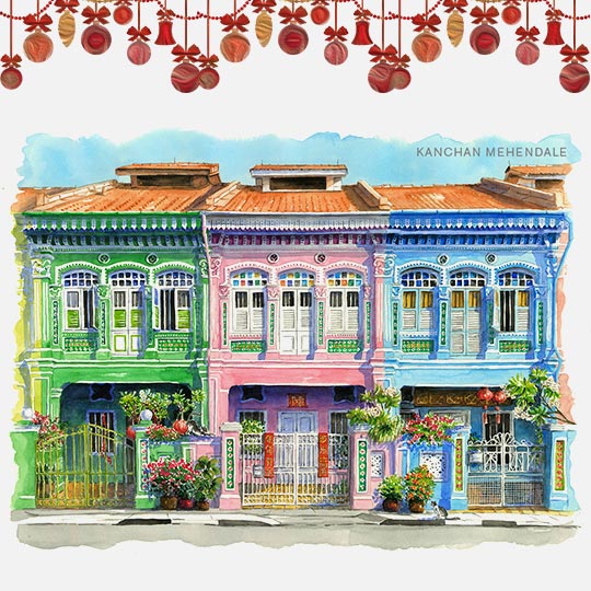 Colourful Christmas Shophouses In Watercolor by Kanchan Mehendale