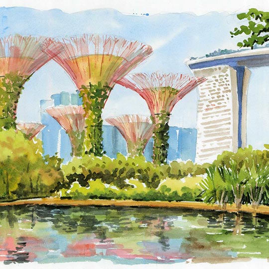 The theme centres on Gardens by the Bay, where towering Supertrees, lush greenery, and the gentle flow of the river come together in a distinctive garden-city landscape, with a subtle glimpse of Marina Bay Sands anchoring the scene within Singapore’s skyline. The interplay of organic forms and modern structures creates a visually rich subject, offering opportunities to capture atmosphere, depth, and light through soft washes, strong silhouettes, and reflective surfaces, while conveying the calm yet futuristic character of this iconic setting.