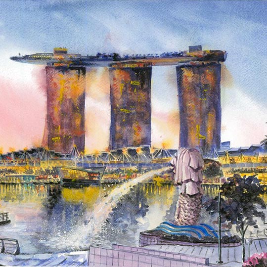 The workshop also explores watercolour approaches for handling contrasting textures, from soft foliage and open skies to defined structures and shimmering water surfaces. Through thoughtful colour choices and tonal control, participants will learn how to create depth, scale, and a sense of calm movement. This subject offers a harmonious mix of structure and fluidity, making it suitable for both beginners and experienced artists seeking to capture Singapore’s unique blend of nature and modern design.