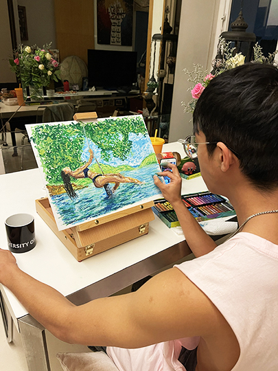 Through this live demo, we will break down the benefits of Kuelox soft oil pastels in art making and showcase techniques to replicate the visuals of an oil painting. Get first-hand understanding of how oil pastels interact with canvas. Understand and learn how to blend and layer with Khaitama’s personal technique of ‘speed-impressionism’ derived from his drumming background as he draws to the rhythm of his oil pastels.