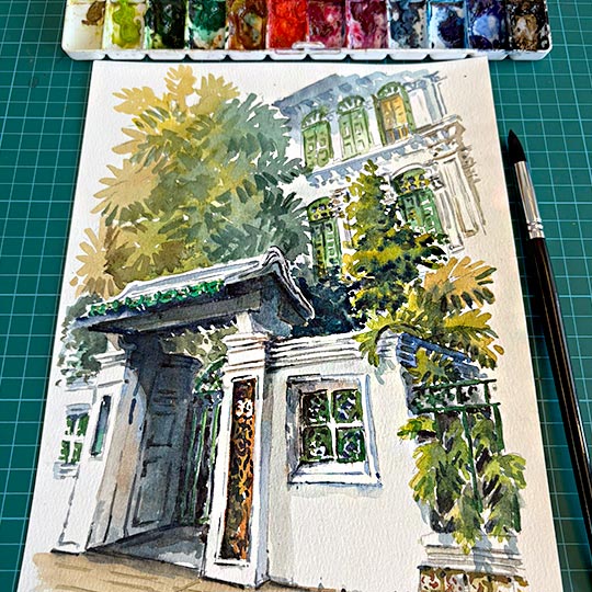 Inspired by the charming streets of Emerald Hill — where Peranakan architecture meets tropical greenery — this watercolour workshop is all about capturing depth, light, and atmosphere in a loose, artistic, expressive style.